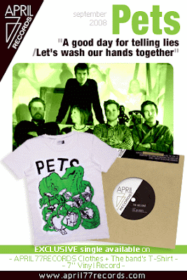 April77 Records在昨日發行的瑞典團Pets 'A good day for telling lies / Let's wash our hands together',同樣是9月要注目的焦點,買7"+T Shirt一直都是April77 Records這新廠牌的宣傳手法,另外只要是買April77 Records的服飾(非April77)都可憑吊牌上所附的序號前往April77 Records網站裡下載當月發行的7"中的兩首歌,接下來10月要發行的Project:KOMAKINO則是自己很矚目的UK新團,Project:KOMAKINO的Black T一定要購入。
